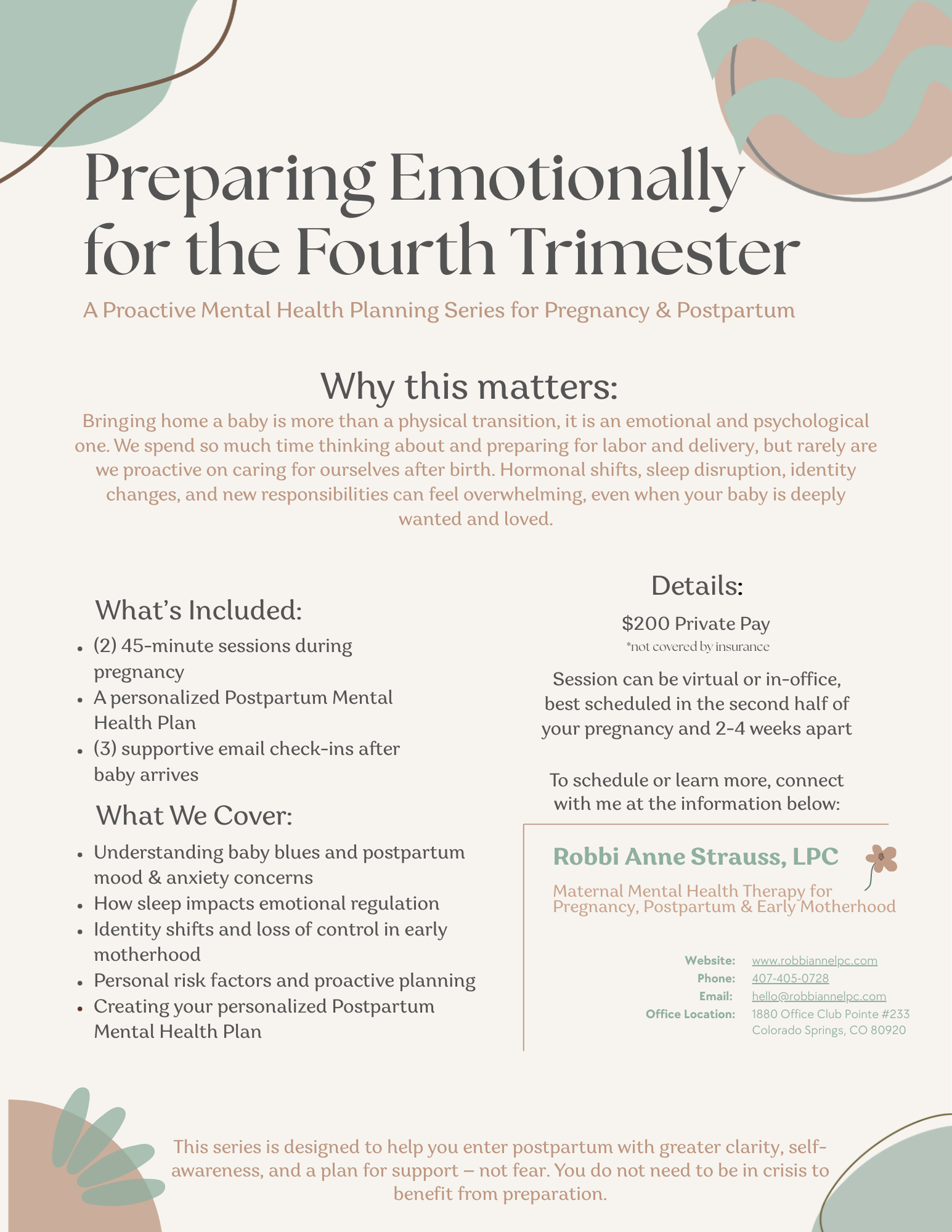 This session series is focused on having insightful conversation on the postpartum period, learning various tools for managing the stress and transition, and developing a plan you can utilize once you enter the fourth trimester.